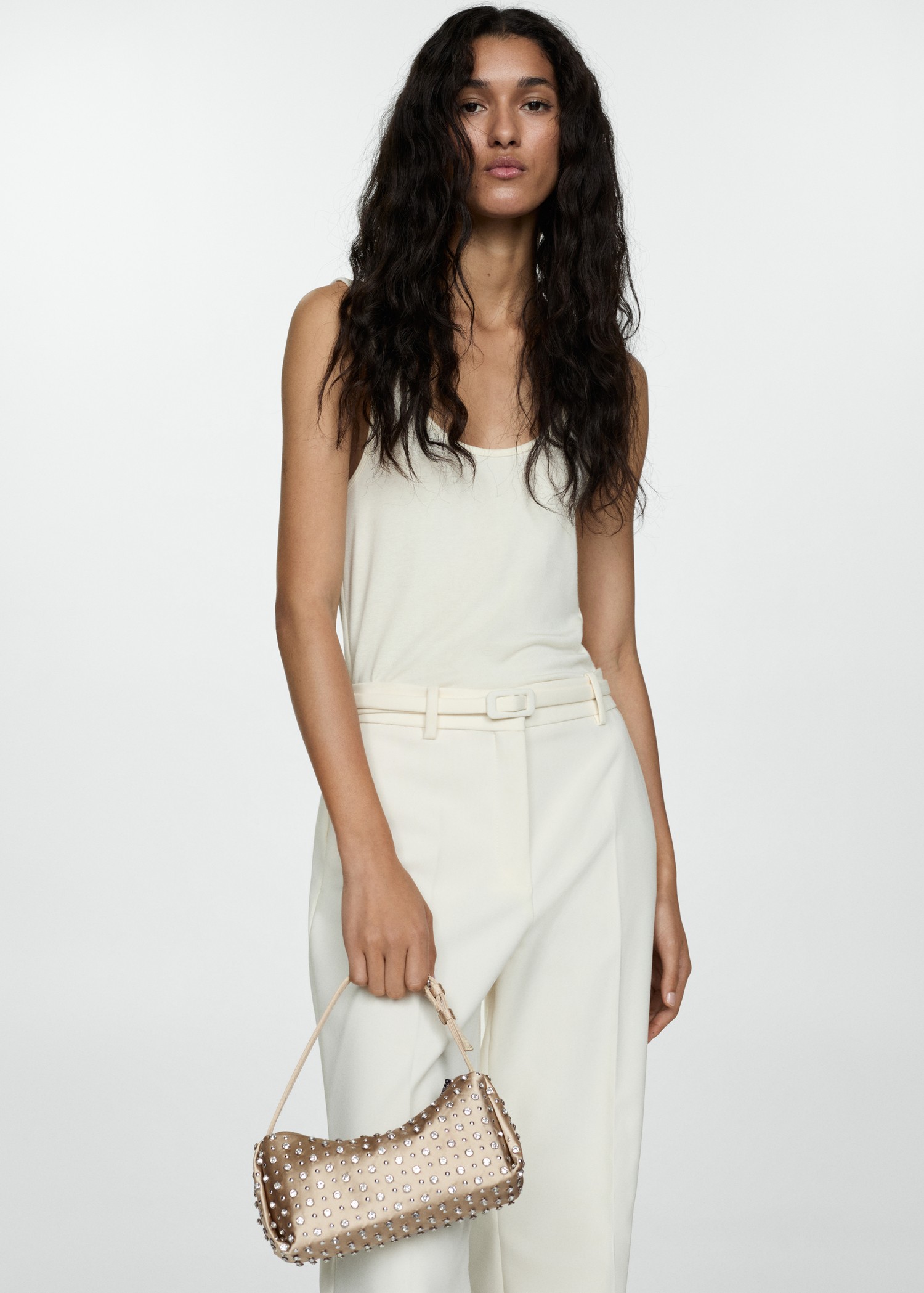 DescripciónTamaño pequeño. Asa corta ajustable. Asa de hombro. Cierre de cremallera. Detalle de abalorios. Detalle de cristales decorativos. Forro interior.23.0×11.0x6.0 cm (Largo x Alto x Ancho).