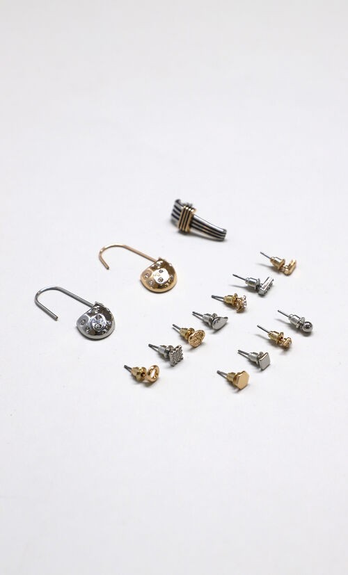Set aretes color plateado y dorado, con diferentes diseños con brillos.